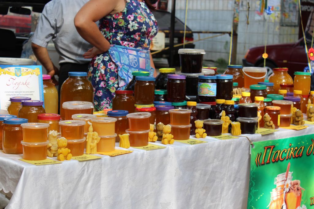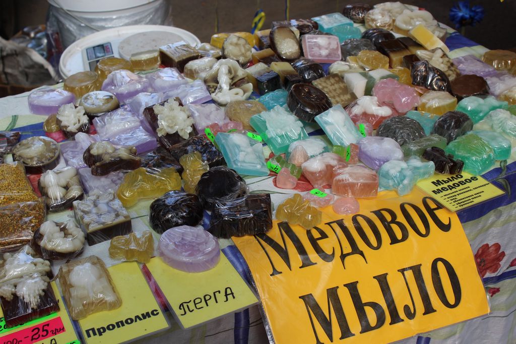 Но больше всего ярмарка изобилует медом и продуктами его производства: медовым мылом, косметикой, лекарственными препаратами и, конечно же, настоящей медовухой. Мед продают на любой вкус и цвет: из акации, подсолнуха, кориандра и смешанные вкусы. Продавцы с радостью расскажут и покажут какой из чего, а также о вкусовых особенностях разных сортов. Также на ярмарке можно купить соты и куски готового воска. Цены на мед абсолютно разные, все зависит от сорта и количества: начиная от 16-20 грн. за 100 гр. и заканчивая 150 грн. за 3-литровую банку.