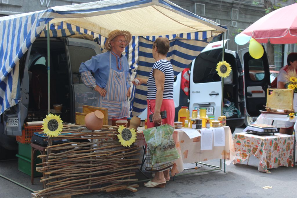 Но не только яблоками и продуктами пчеловодства богата ярмарка. Во многих палатках торгуют и другими фруктами, которым пришло время поспеть: сливами, персиками, виноградом. Продают на ярмарке и овощи: помидоры, перец, картошку, а также подсолнечное масло.