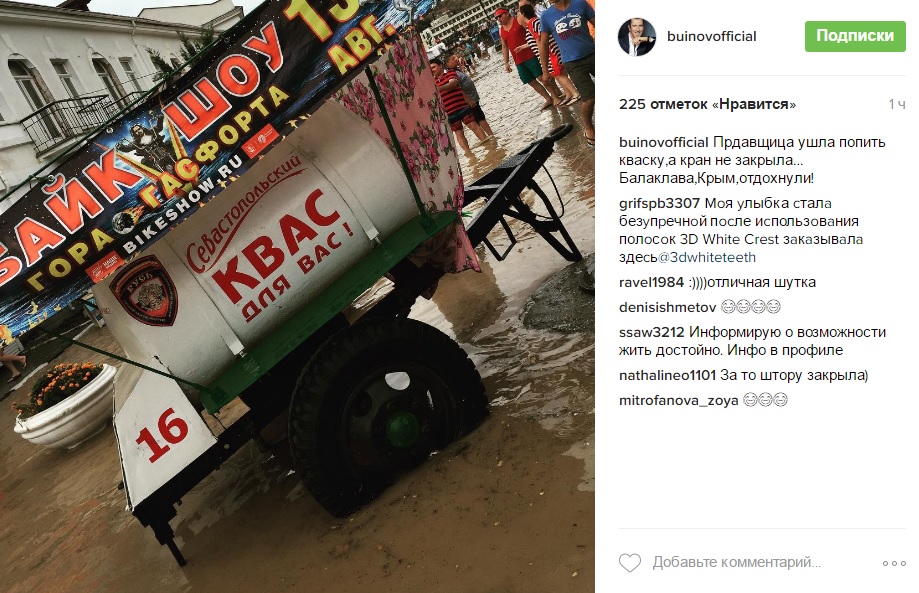 Соответствующую фотографию артист опубликовал в своем Instagram. "Продавщица ушла попить кваску, а кран не закрыла... Балаклава, Крым, отдохнули!" – подписал он иронично фото.