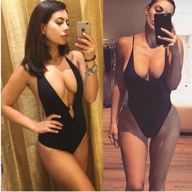 Рамина сделала селфи в черном сплошном купальнике, который по дизайну напоминает купальник Ким Кардашьян, и создала коллаж, совместив свое и Ким фото.