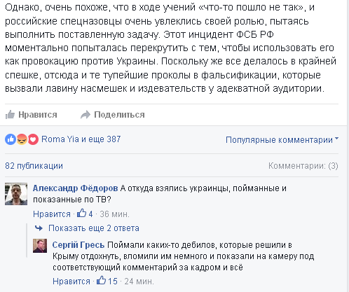 По мнению Тымчука, в ходе учений "что-то пошло не так", и российский спецназ очень увлеклись своей ролью, пытаясь выполнить поставленную задачу. Он отмечает, что ФСБ РФ моментально использовала это как провокацию против Украины.