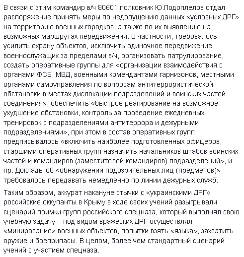 Он со ссылкой на источники ИС среди крымских военных рассказал, что накануне событий с "диверсиями" в ряд воинских частей, дислоцирующихся на оккупированном полуострове, пришла телеграмма о том, что в Крыму действуют три группы российского спецназа, задача которых изображать "условных диверсантов".
