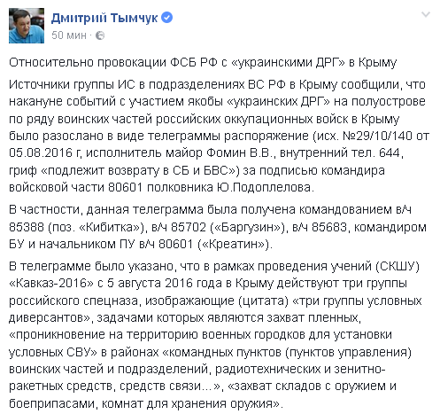 В истории с так называемыми крымскими "диверсиями" появилась важная деталь про телеграмму от военной "верхушки". Об этом сообщил руководитель группы "Информационное сопротивление" (ИС), народный депутат Дмитрий Тымчук на своей странице в Facebook.