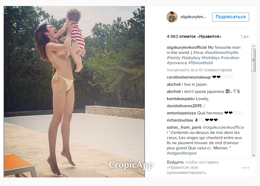 36-летняя актриса Ольга Куриленко сейчас проводит время вместе со своим наследником — очаровательным Александром Максом Горацио. Недавно знаменитость поделилась в «Инстаграме» первой фотографией наследника, сделанной в Провансе. На ней запечатлен момент семейной идиллии. Счастливая Ольга держит на руках ребенка и радостно улыбается ему. Мальчик одет в модный комбинезон в бело-красную полоску, а его мама позирует в бикини.«Мой самый любимый мужчина в мире», — подписала звезда публикацию.