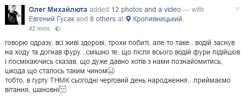 По его словам, в результате ДТП с участием грузового автомобиля музыканты получили небольшие травмы.