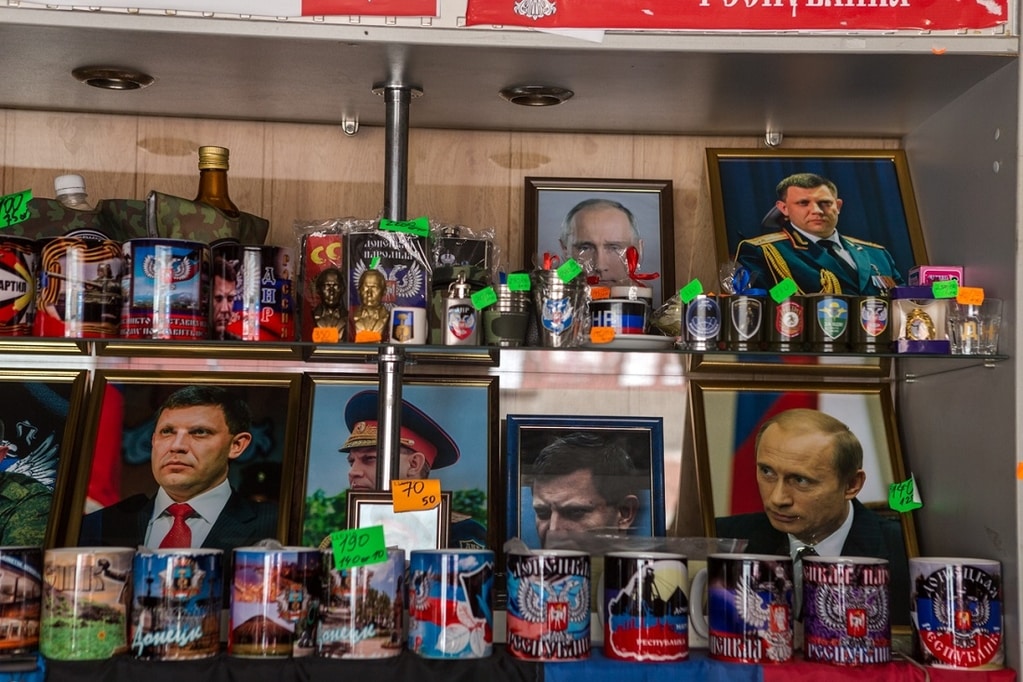 Сувениры в "ДНР" появились давно. Года полтора назад уже можно было купить любые шевроны, нашивки, флаги и т.д. Сейчас ассортимент расширился. Кружки, майки, зажигалки, обложки на паспорт... Со всего этого на вас смотрит Захарченко и Путин.