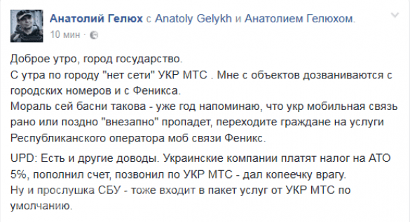 При этом отмечается, что в городе продолжает работать украинский оператор Life и местный "Феникс".