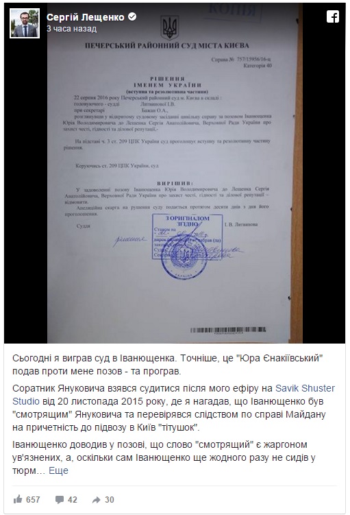 Народный депутат Сергей Лещенко сообщил у себя в Facebook о том, что выиграл суд у экс-регионала Юрия Иванющенко.