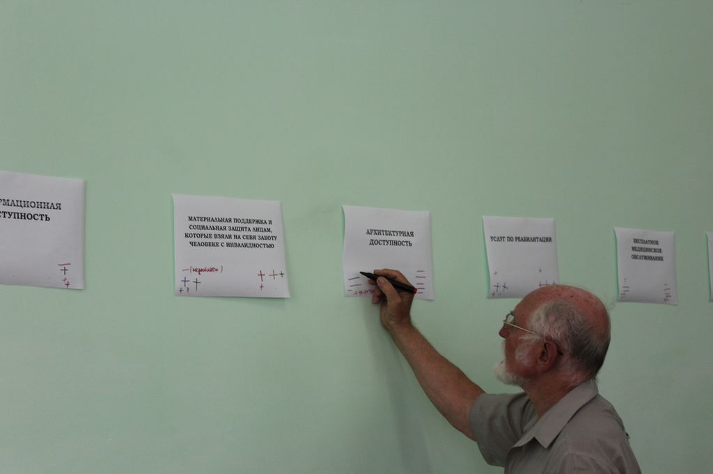 Целью сегодняшнего круглого стола было сообща определить основные, всем известные проблемы, с которыми сталкиваются люди с инвалидностью, выявить новые, возможно кому-то неизвестные и найти пути их решения. Чтобы было легче ориентироваться в этом вопросе, на стене был вывешен список этих самых проблем. Каждый присутствующий мог поставить рядом плюс или минус - решаются эти проблемы или нет. В большинстве своем рядом с проблемами стояли минусы.