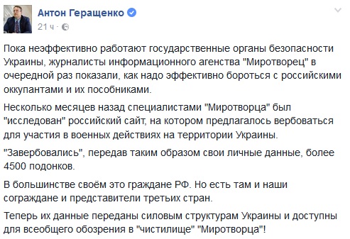 "Несколько месяцев назад специалистами "Миротворца" был "исследован", российский сайт, на котором предлагалось вербоваться для участия в военных действиях на территории Украины. "Завербовались", передав таким образом свои личные данные, более 4500 подонков", - написал он.