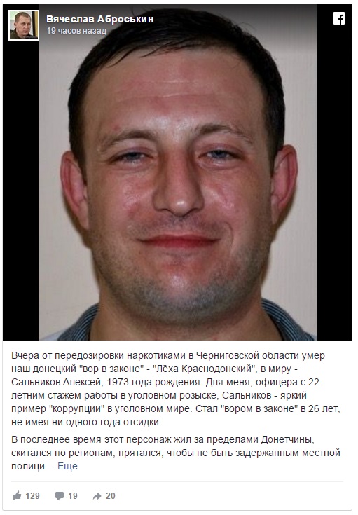 25 августа в Чернигове от передозировки наркотиками скончался Алексей Сальников - донецкий вор в законе, известный как "Леха Краснодонский". Об этом на своей странице в Facebook сообщил начальник Главного управления Национальной полиции в Донецкой области Вячеслав Аброськин.