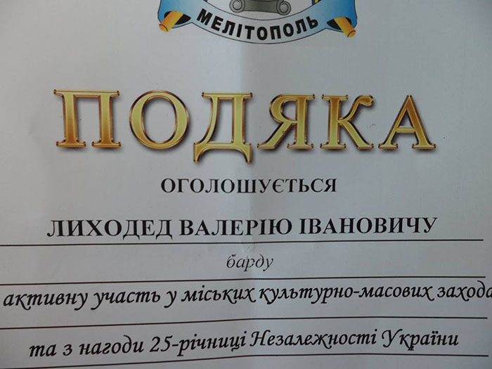 В том числе такую благодарность получил известный мелитопольский автор-исполнитель Виталий Лиходед. Отметим, что Виталий ведет еще и активную волонтерскую деятельность, неоднократно ездил в зону проведения АТО, где радовал бойцов своими песнями. Поэтому благодарность мы считаем вполне заслуженной.