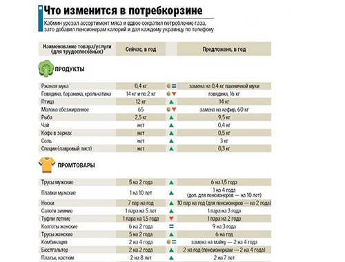 ЧТО В КОРЗИНЕ НОВОГО. Как видно из инфографики, главные изменения коснулись лекарств, их перечень теперь намного больше. Значительно выросли нормы потребления рыбы: с 2,5 до 9 кг в год, добавлены такие привычные вещи, как чай — 400 г в год, лавровый лист, соль и даже полкило кофе в зернах. Новые нормы и по одежде: вместо пальто на 8 лет — куртка на 5 лет, мужчинам разрешили иметь 6 пар трусов на год (было 5 на 2 года), дамам — 2 бюстгальтера на год (было 2 на 2 года), а пенсионеры смогут загорать не в семейных трусах, а в плавках. Женщинам официально разрешили иметь брюки, одну пару на 4 года.