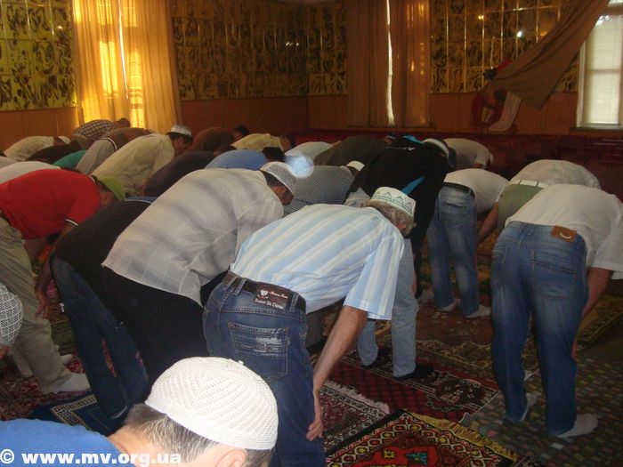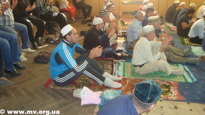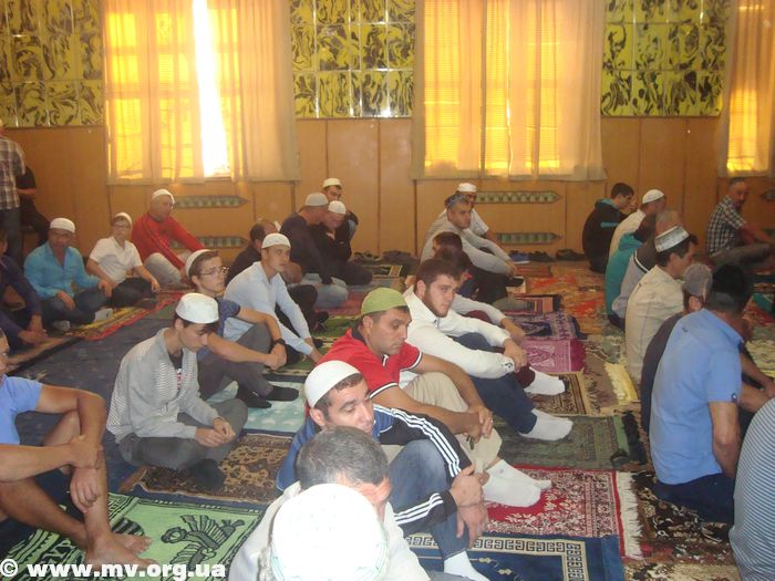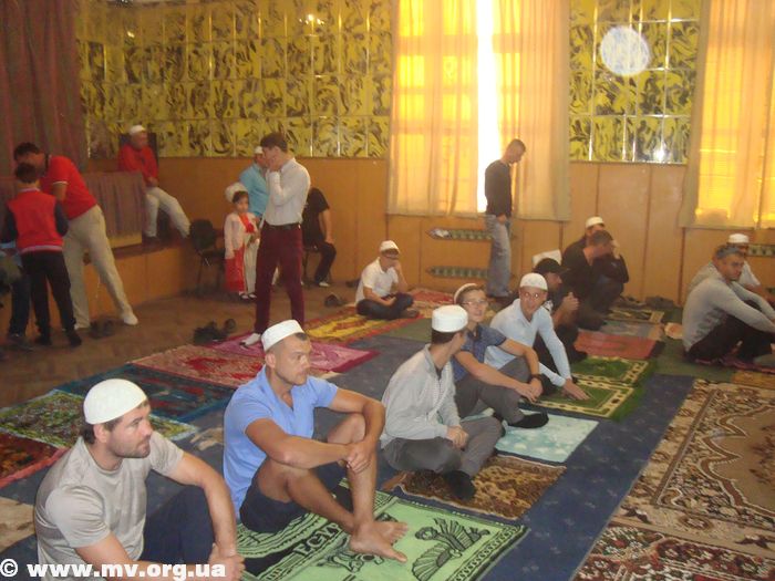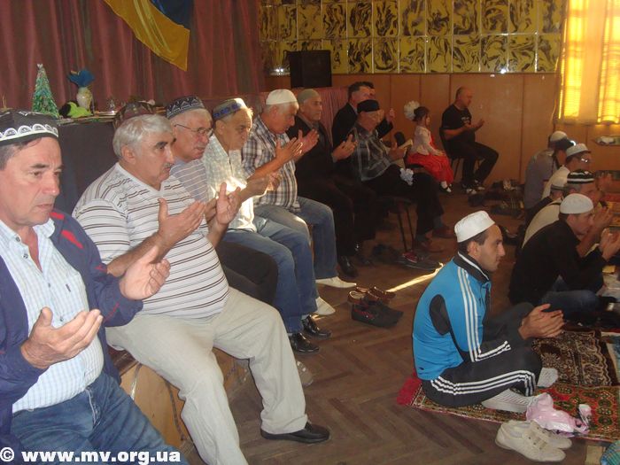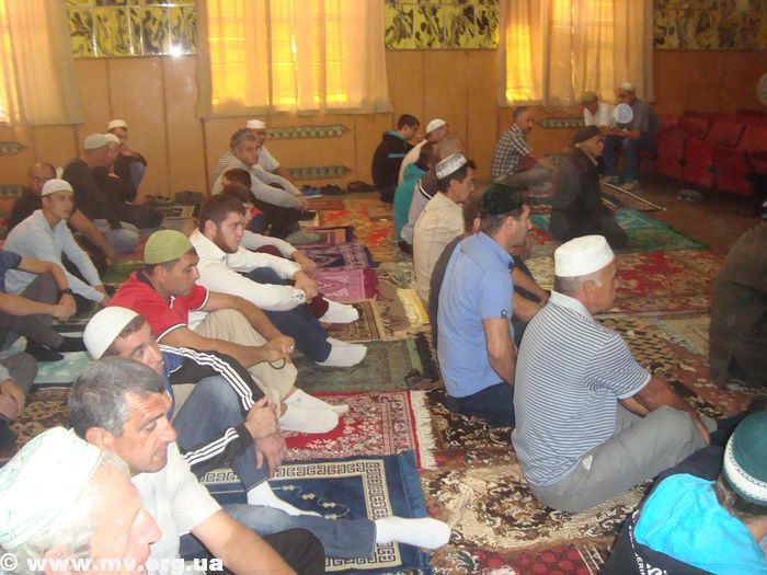У входа в ДК Железнодорожников стоят около десятка мужчин и всего лишь одна девочка дошкольного возраста, с пышным белым бантом в волосах и в красном платьице. У большинства мужчин на голове аккуратные традиционные головные уборы. Это крымские татары Мелитополя собираются к началу торжественного богослужения, посвященного празднику Курбан-байрам (праздник жертвоприношения).