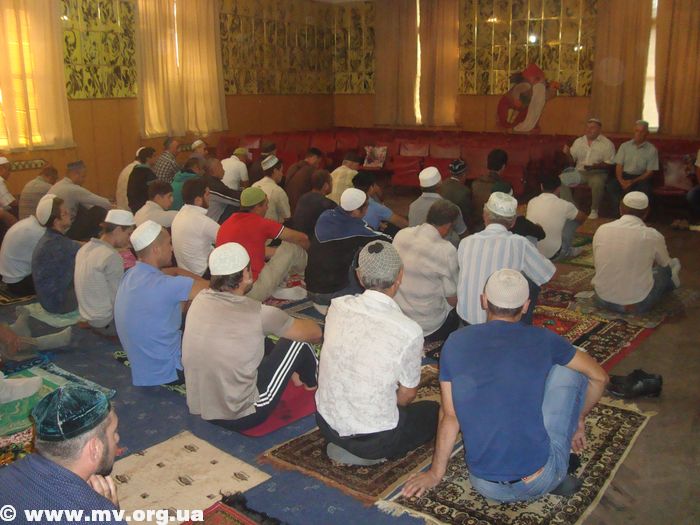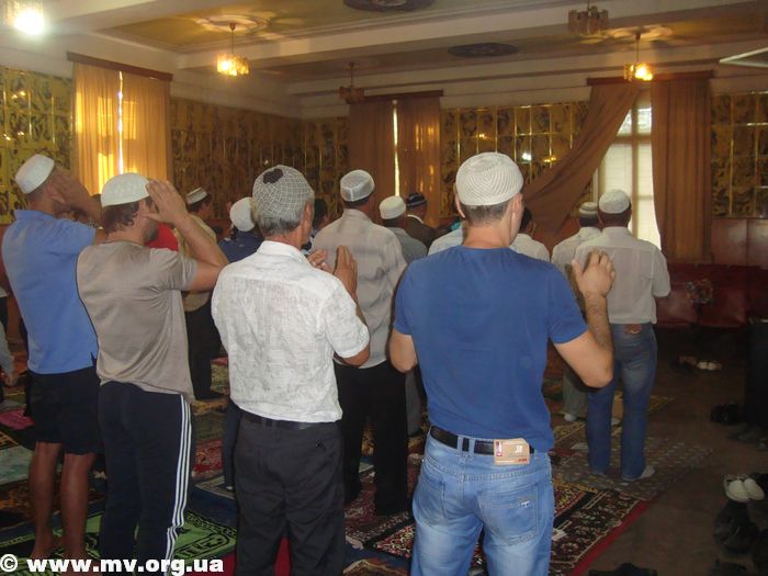 В комнате, где каждую пятницу крымские татары молятся, набралось уже до ста мужчин разных возрастов, и среди них по-прежнему всего лишь одна маленькая девочка, которая тихонько сидит на стуле позади всех и рассматривает рисунки панелей на стенах. Хотя пол устлан коврами, каждый вошедший расстилает свой небольшой коврик и усаживается на него прямо на пол. Исключение только для стариков – они присели на стулья позади всех.