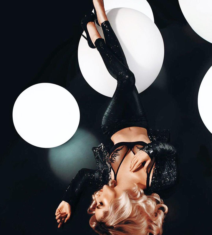 На фотографии Лобода лежит на земле, задрав ноги вверх. Она одета в кожаные лосины, черные туфли, блестящую накидку и прозрачный бюстгальтер.