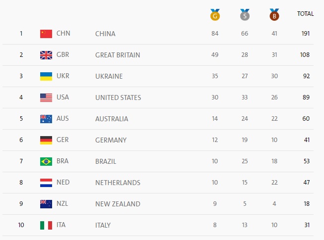 Таким образом у нас уже 92 медали: 35 золотых, 27 серебряных и 30 бронзовых. Украинцы не только преодолели рекорд Лондона в Рио, они уже восемь дней подряд удерживают третью позицию на Паралимпиаде-2016 после Китая и Великобритании.
