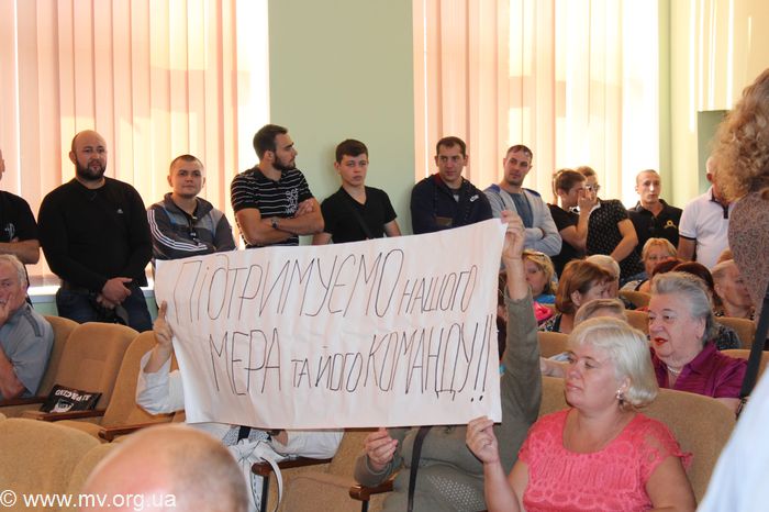 Впрочем, общественники, поддерживающие Сергея Минько, также пришли в конференц-зал не с пустыми руками. В этот раз кроме традиционных плакатов "Підтримуємо нашого мера та його команду", у них было распечатано фото нардепа Евгения Балицкого, демонстрирующего средний палец фотографу.