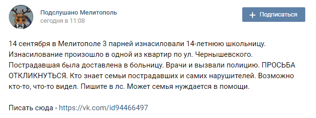 В паблике "Подслушано Мелитополь" просят откликнуться свидетелей группового изнасилования 14-летней школьницы, которое, якобы, произошло 14 сентября в одной из квартир на ул. Чернышевского.