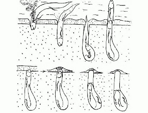 Так, с наступлением засушливого сезона протоптер начинает готовиться к спячке. В этот период он роет себе гнездо, где впоследствии проведет 6−9 месяцев или гораздо больше, пока снова не появится вода. Свою нору эта рыба роет ртом, выбрасывая размельченный грунт через жаберные щели. И когда «спальня» готова, протоптер забирается в неё и остается там до полного спада воды. В гнезде он занимает такое положение, чтобы можно было время от времени высовываться из него для дыхания, а затем, не разворачиваясь, уходить назад. Во время таких поршневых движений нора будет постепенно закупориваться грунтом, пока совсем не закроет входное отверстие. Когда это случится, рыба перестанет высовываться наружу, но будет тыкаться мордой в образовавшуюся «пробку». Таким образом она создаст на входе земляной «колпачок», который, когда вода полностью высохнет, покроется трещинами. Через них будет просачиваться воздух, что позволит рыбе дышать на протяжении всей спячки. А после того, как вход замурован, протоптер начнет выделять огромное количество слизи, чтобы поддерживалась необходимая для него влажность. Впрочем, не все протоптеры пережидают неблагоприятные условия в таком гнезде.