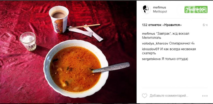 В своем микроблоге Instagram нардеп, побывавший проездом в нашем городе, опубликовал фото своего завтрака. Мустафе Наейму с утра захотелось горячего и он заказал в привокзальном кафе борщ и кофе. Один из комментаторов назвал трапезу "олигархичной", другой же отметил, что на столе, как всегда, несвежая скатерть. Понравился ли ему борщ, нардеп, к сожалению, не написал.