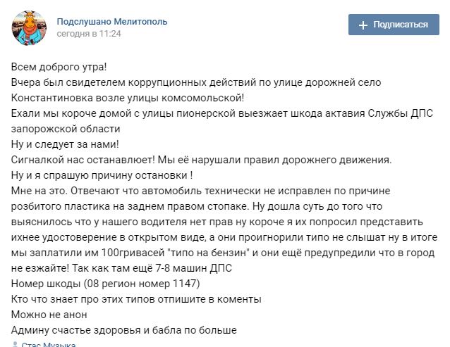 Автор поста назвал и номера патрульной машины, причем своего имени также скрывать не стал. Смелый поступок как для соучастника группового преступления "Дача взятки должностному лицу".