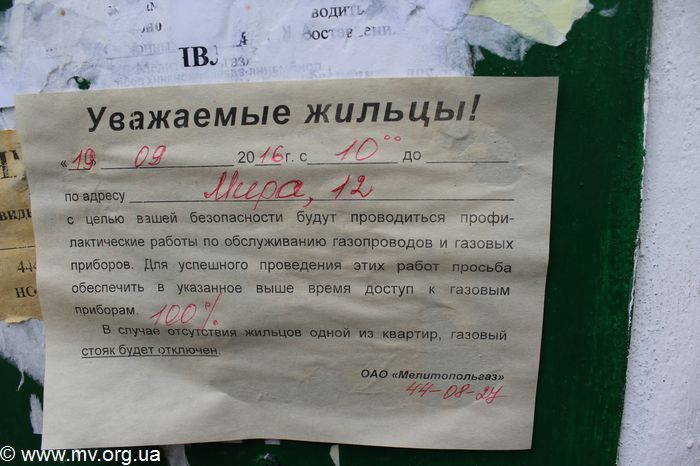 Сотрудники «Мелитопольгаза» отметили, что если какие-то акты и были подписаны, то это акты на отдельные квартиры, где вентиляция проверялась при установке газового оборудования. Все дома поквартирно проверялись только начиная с 1 сентября. О проведении проверки жильцы были предупреждены заблаговременно, с помощью расклеенных на подъездах объявлений. Денег же за проверку вентиляции никто не берет. Платным может быть только обслуживание вентканалов, но «Мелитопольгаз» такие услуги в Мирном не оказывает.