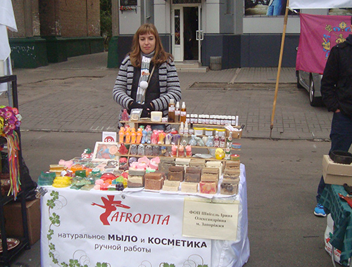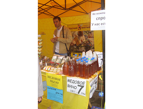 У прилавка с медовухой мужики стоят прямо-таки с детской улыбкой на лице и пробуют ее по 5 гривен за стаканчик. Сразу за продавцом медовухи выстроилось много продавцов меда. Напротив них – торты и колбасные изделия из Бердянска, Веселого.