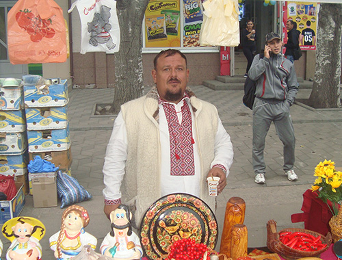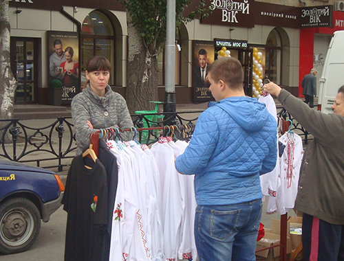 Парень в синей куртке долго выбирает себе рубашку-вышиванку. Он широк в плечах, но при этом не слишком-то высок ростом. Продавщица ему показывает то одну, то другую модель. Сорочки стоят в среднем по 400 гривен за мужскую, и по 350 за женскую. «Кому они нужны, эти вышиванки!» – говорит какая-то пенсионерка, а ее подружка ей возражает: «Это же очень красиво, это настоящее искусство!».