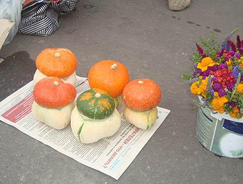 За раскладкой картин 4 женщины разложили на ящиках еду и спокойно завтракают. Их не волнуют толпы людей, они приехали издалека и сейчас наверстывают то, от чего отказались ради участия в этой ярмарке. Кстати, никаких ссор из-за мест торговли нет – все места заранее расписаны мелом на асфальте – Лебедонька, Горнич, Гайсумова.