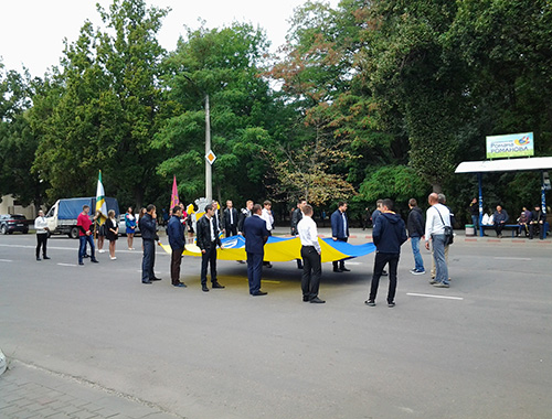 Колонна растянулась на несколько десятков метров и состояла из сотен человек. Во главе колонны шествовали студенты МГПУ, несущие огромный флаг Украины. За ними следовали лучшие студенты ТГАТУ с гербом Мелитополя, а также флагами нашего города и Запорожской области.