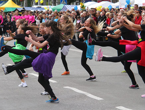 На площади каждая часть колонны была представлена многочисленным зрителям, творческие коллективы демонстрировали свое мастерство, перечислялись их заслуги и достижения спортсменов. Во время этого присутствующие имели возможность заочно познакомиться с руководителями коллективов и секций, председателями общин и прочими, кто из года в год делает наш город лучше.