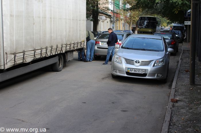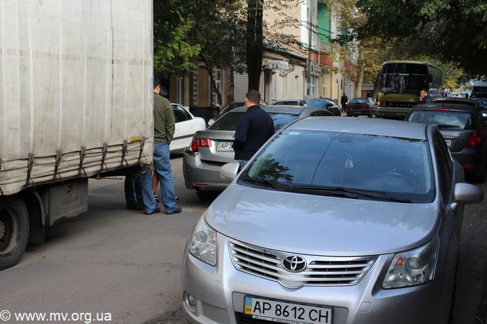 Серебристая «Хонда» столкнулась с грузовиком, при этом оба автомобиля получили легкие повреждения задних бамперов. Причиной аварии стала неправильная парковка одного из автомобилей.
