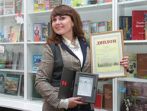 В номинации "Зрительские симпатии" больше всех голосов набрала сотрудница отдела документов иностранными языками Запорожской областной универсальной библиотеки им. Горького Анастасия Бабанина. Ей вручили корону, диплом и флешку с моноподом.