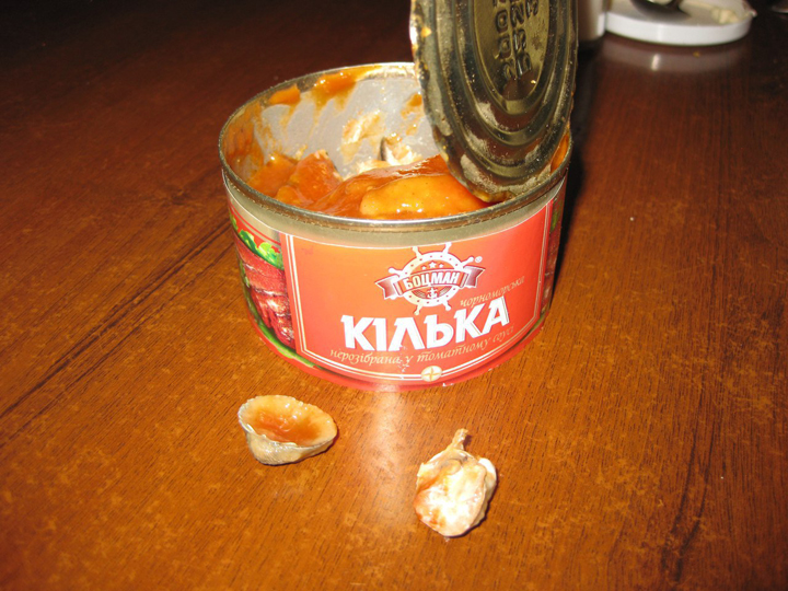Мелитополец решил отведать рыбных консервов и приобрел банку кильки в томате в супермаркете АТБ. Но кроме собственно рыбы и томата, он обнаружил в банке и несколько ракушек. Видимо, кильку на предприятии решили не извлекать окончательно из окружающей среды и законсервировать вместе с содержимым дна.