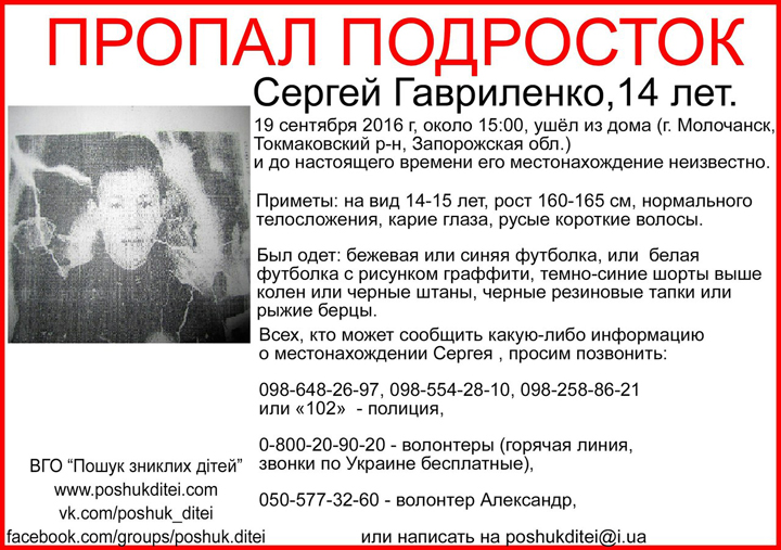 Сергей Гавриленко 2002 г.р. проживал в Молочанске по адресу: ул. Крупской, 73. 19 сентября около 15.00 он ушел из дома и не вернулся. Приметы мальчика: рост 150-155 см, короткие волосы темно-каштанового цвета, худощавое телосложение. Если у вас есть информация о несовершеннолетнем или месте его пребывания, сообщайте о ней в Мелитопольский горотдел полиции по тел. (0619) 44-80-02; (06192) 6-80-87 или 102.