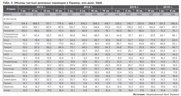 Объем переводов из Польши, в последние годы лидирующей по количеству трудовых мигрантов-украинцев, например, едва превысил 55 млн долл. В 2016-м спад поступлений замедлился, за два квартала с.г. из России в Украину поступило 266,8 млн долл., за два квартала 2015-го — 318,7 млн.