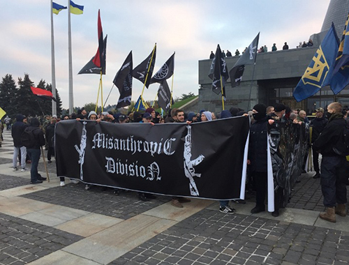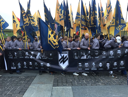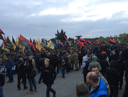 В центре Киева проходит "Марш нации", в котором принимают участие организации "Азов", "Правый сектор", "С14". Об этом сообщает корреспондент "ОстроВа" с места событий.