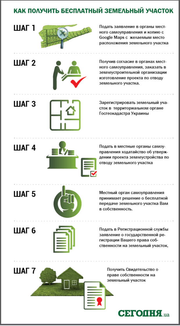Получить участок земли можно в любом регионе страны, и это не зависит от места жительства. Для ее приватизации необходимо найти свободный участок. В зависимости от того, где он находится — в пределах города, села, или района — в те органы самоуправления и нужно обращаться. Если земельный участок за пределами населенного пункта, нужно идти в территориальное отделение Госгеокадастра — обычно это земли для ведения садоводства или личного сельского хозяйства. Сама земля ничего не будет стоить украинцу, но оформление документов потребует трат.