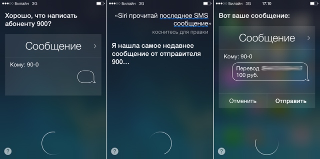 Сбербанк требует подтверждения перевода также с помощью СМС-сообщения. После того как банк прислал код, надо попросить Siri прочитать последнее сообщение и отправить пять цифр кода на номер 900 также с помощью Siri. Перевод прошел, вся операция заняла около двух минут.