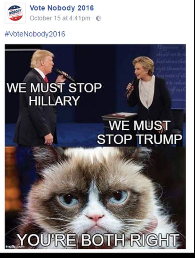 Популярность второго варианта неуклонно растет, в том числе благодаря онлайн-кампании Vote Nobody ("Голосуй против всех"), в рамках которой пользователей призывают не голосовать за Хиллари Клинтон и Дональда Трампа на президентских выборах 8 ноября.