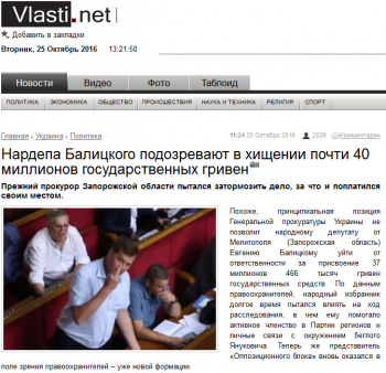 На сайте Власти.нет (мелитопольского происхождения, но ориентированного на Украину в целом) появился текст под громким заголовком: «Нардепа Балицкого подозревают в хищении почти 40 миллионов государственных гривен».