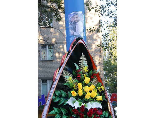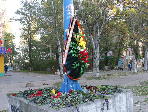 Еще вчера к ней начали приносить живые цветы. Теперь опора покрыта ими полностью. На ней установлен венок и прикреплено фото погибшего.