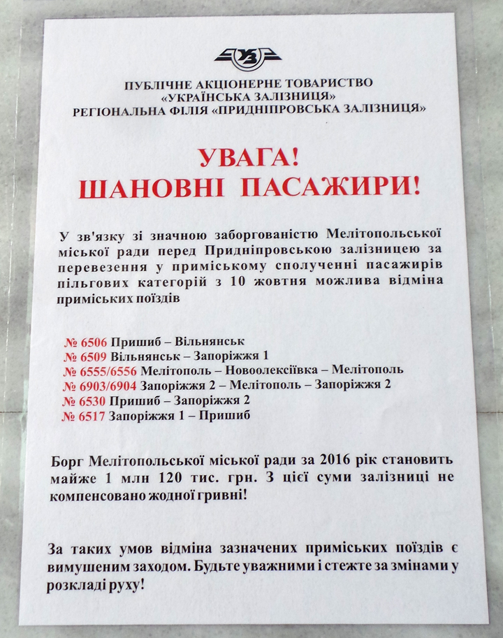 Долг Мелитопольского горсовета за 2016 г. составляет 1 млн. 120 тыс. грн. Так что в ближайшее время возможна отмена таких электричек: №6555/6556 Мелитополь - Новоалексеевка - Мелитополь и №6903/6904 Запорожье-2 - Мелитополь - Запорожье-2.