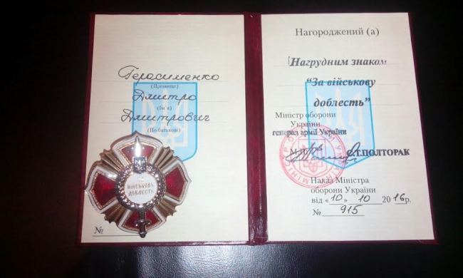 К Дню защитника Украины Дмитрий Герасименко был награжден нагрудным знаком «За военную доблесть» - одной из самых высоких наград для военнослужащих, также получил досрочно звание подполковника.