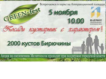 5 октября в Мелитополе состоится акция по озеленению города «GREEN-fest 2016», в рамках которого планируется высадить 2 тыс. кустов бирючины. Акция организована Мелитопольской волонтерской группой "Патриот" совместно с ОО "Свідоме суспільство Мелітополя", БФ "Улыбка ребенка" при поддержке городской власти.