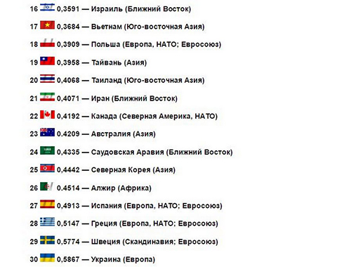 Топ-30 стран по состоянию на 4 января 2016 года в базе данных Global Firepower:
