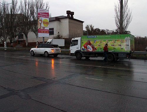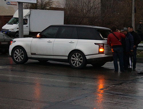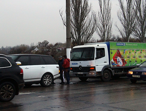 Сегодня около 16 часов на дамбе произошло столкновение двух автомобилей – морозильник-грузовик «Мерседес» на подъеме, за 30 метров до светофора, врезался сзади в белый внедорожник Range Rover.