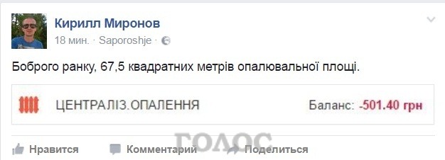 Так, Кирилл Миронов запостил данные о начисленной ему сумме за отопление 67,5 кв. метров.