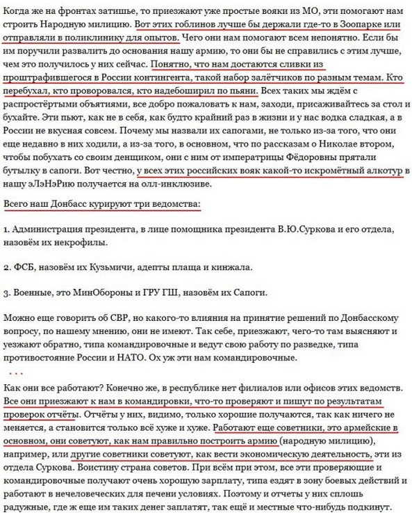 «Чего они нам помогают, всем непонятно. Если бы им поручили развалить до основания армию, то они бы не справились с этим лучше, чем это получилось у них сейчас. Понятно, что нам достаются «сливки» из проштрафившегося в России контингента, кто перебухал, кто проворовался, кто надебоширил по пьяни… Эти пьют, как не в себя, как будто крайний раз в жизни, и у нас водка сладкая, а в России невкусная совсем… Вот честно, у всех этих российских вояк какой-то искрометный алкотур в нашу ЛНР получается на ол-инклюзиве».